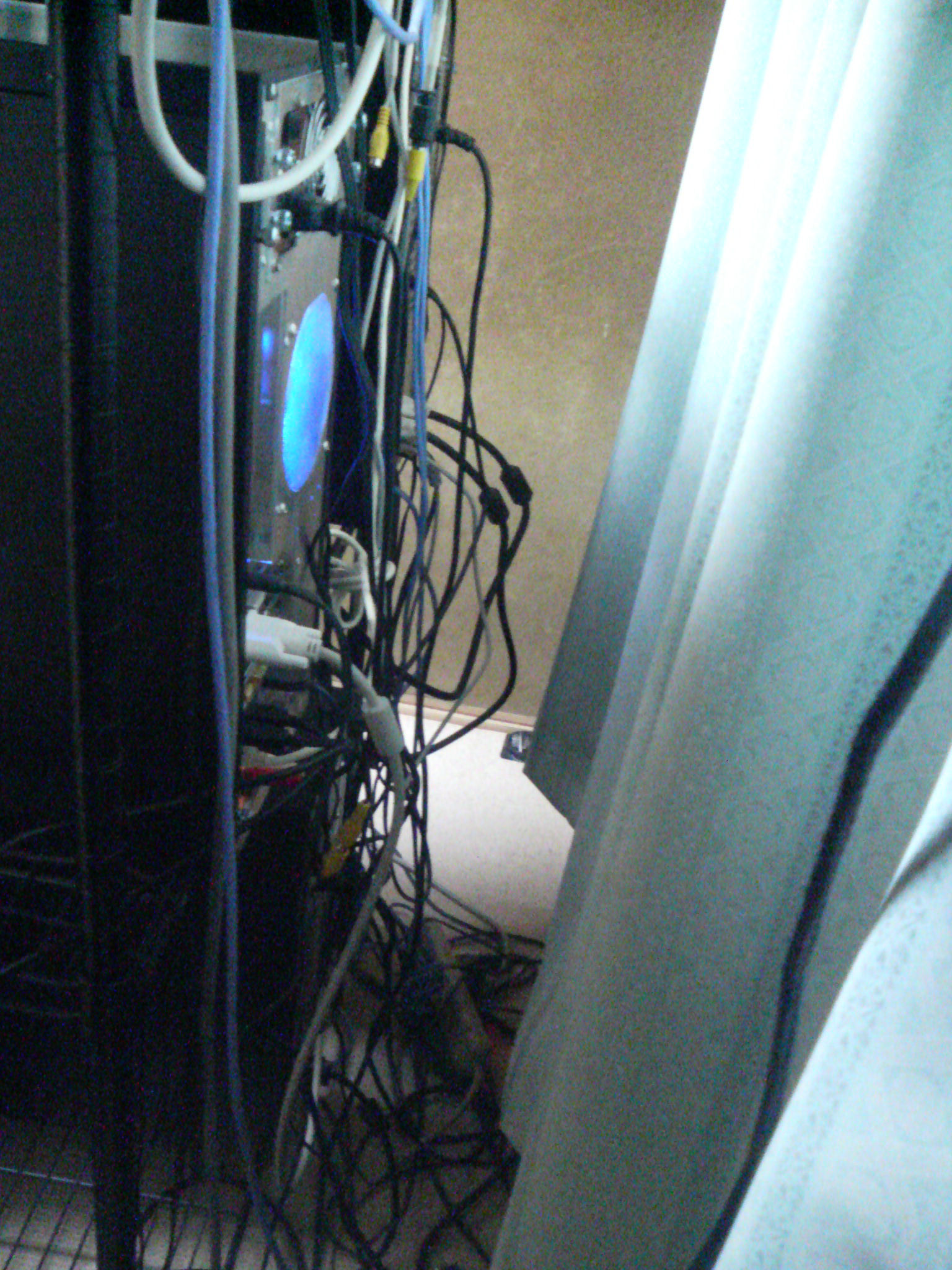 あと,某方面からのリクエストにより,「大変なことになっちゃってる PC 裏側」を大公開.ちなみにカーテンと PC の隙間は狭いので人間は通れませんw