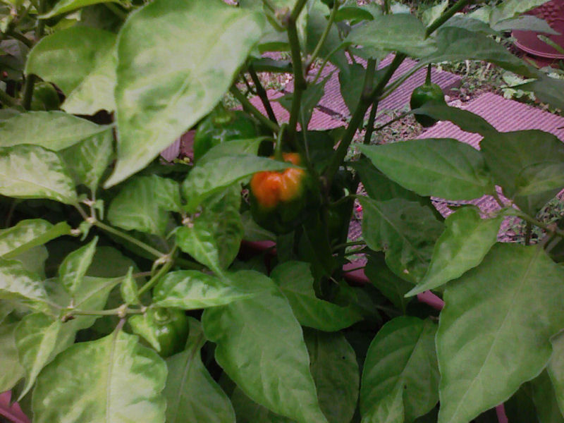 ゲキカラさんは全体が緑からどす黒い赤に変わり始めて数日で実の先の方からきれいな赤になったんだけど,ハバネロさんは実の付け根の方からいきなりきれいなオレンジになっていくのね.