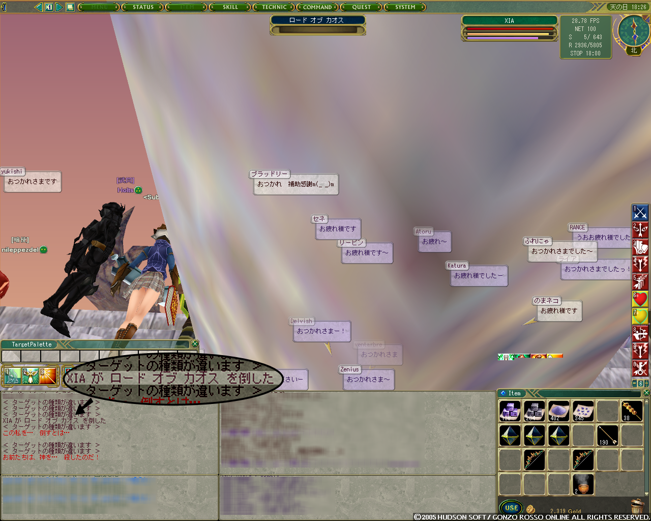 で,戦闘開始ー……と思ったら,最初の LD 波がかつてない強力さで,290人が一気に 58人にw同行してた Sugar のひとも瞬時に消え去りました.南無.しかし 58人でも何とか前衛セットが生き残ったので,ひたすらひたすら矢を打ち込みまくり,
